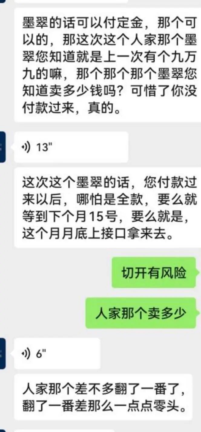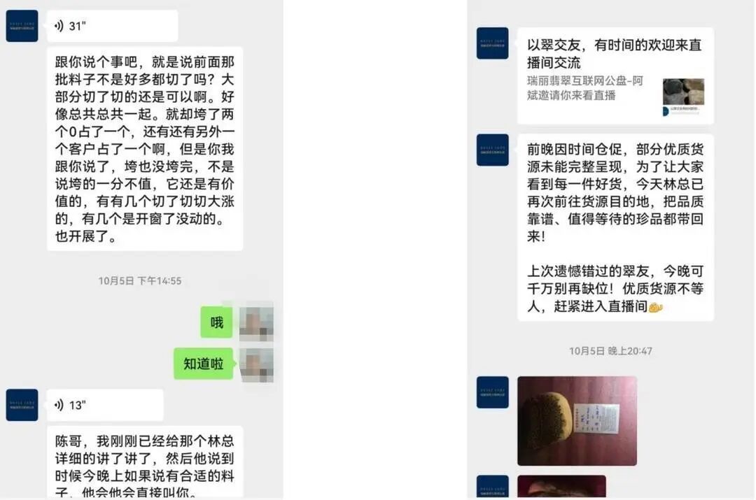 本年国庆假技术,他刷短视频的时候看到一个翡翠原石直播间的告白,之后在客服东说念主员邀请下添加好友,秉承对方对于翡翠阛阓的宣传,并投入直播间不雅看、学习。