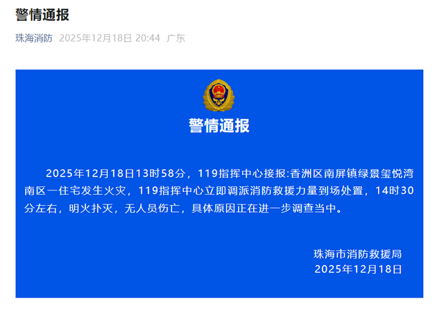 2025年12月18日13时58分,119指点中心接报:香洲区南屏镇绿景玺悦湾南区一住宅发生失火,119指点中心立即调派消防援手力量到场惩处,14时30分阁下,明火扑灭,无东谈主员伤一火,具体原因正在进一步拜访当中。