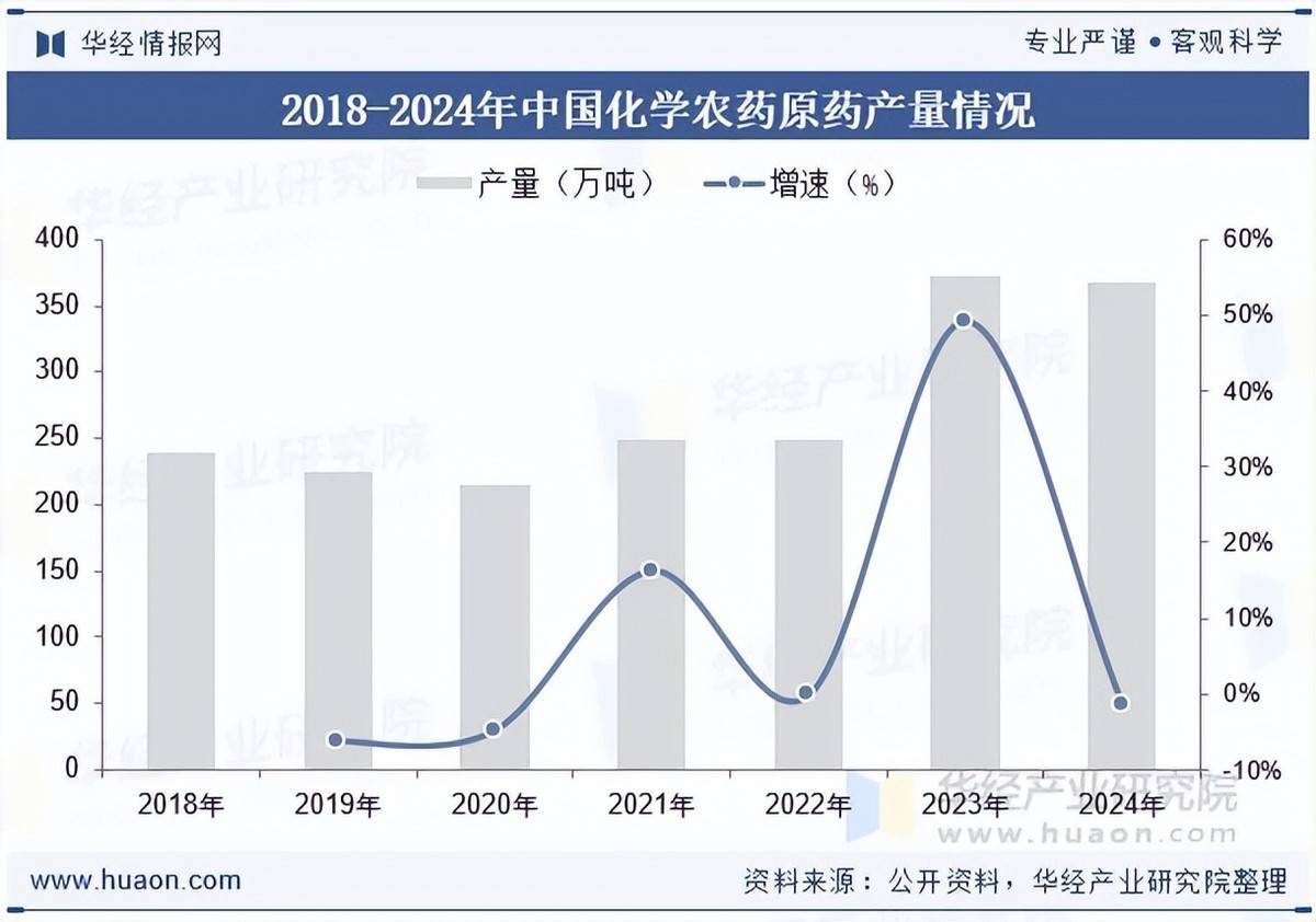 比年来我国农药工业快速发展,已酿成了一套包括科研竖立、原药坐蓐、制剂加工、原材料及中间体配套较为完满的农药工业体系,农药的产量与出口量已处于世界前哨。据统计,2018年我国化学农药原药产量为240万吨,2024年我国化学农药原药产量增长至367.5万吨。