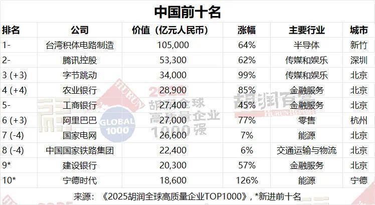 凤凰网科技讯 12月16日,胡润商榷院在深圳福田发布《2025胡润众人高质地企业TOP1000》。成绩于东说念主工智能芯片和数据中心揣摸需求的激增,英伟达超越微软和苹果,成为众人价值最高的公司,价值32.8万亿元东说念主民币,增长49%。苹果以28.6万亿元东说念主民币的价值稳居第二,增长23%。客岁排行第一的微软以26.9万亿元东说念主民币的价值跌至第三,但价值增长13%,反馈了其云业务和企业业务的踏实发展势头。而中国价值最高的三家公司差别是台积电、腾讯、字节很是。