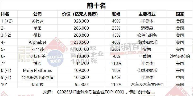 博通和特斯拉置身前十。博通上涨四位至第七位,价值上涨118%至11.5万亿元东说念主民币;特斯拉上涨三位至第十位,价值上涨115%至9.5万亿元东说念主民币。